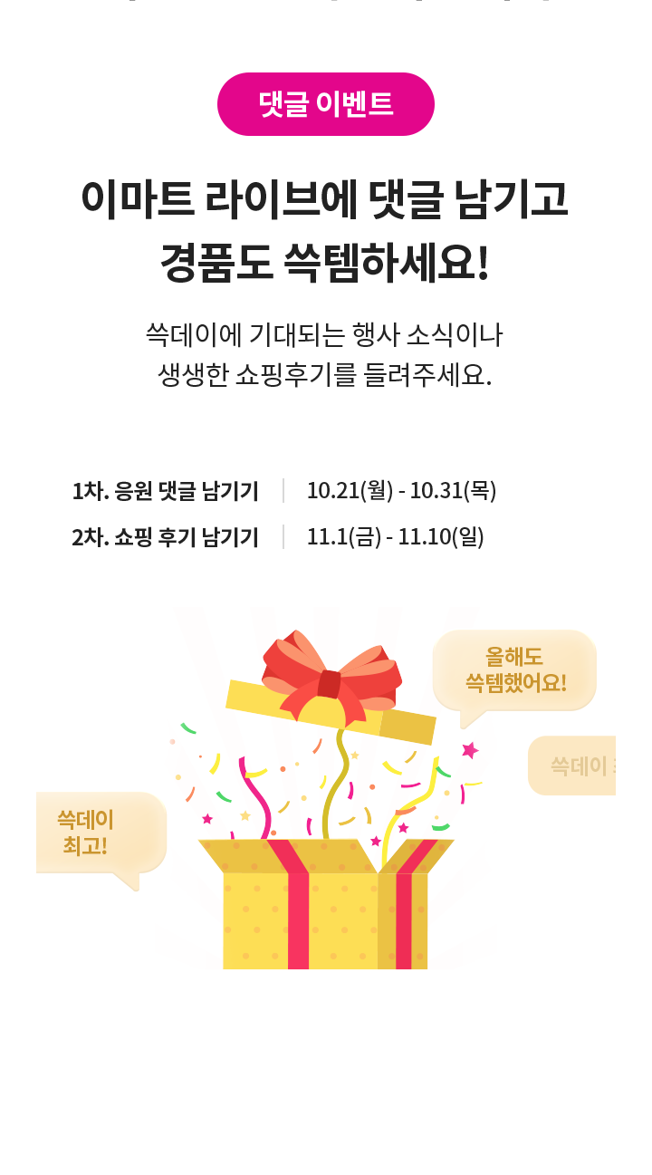 매년 뜨거운 관심을 받는 이마트 쓱데이가 올해도 드디어 찾아왔습니다! 2024년 이마트 쓱데이는 11월 1일부터 시작하여 10일까지 진행되는 대한민국 대표 쇼핑 행사로, 소비자들에게 다양한 제품을 특별한 가격에 구매할 수 있는 기회를 제공합니다. 이번 이마트 쓱데이에서는 다채로운 할인 혜택과 함께 쇼핑 지원금까지 제공되는 풍성한 이벤트가 마련되어 있어 더욱 기대됩니다. 특히 이마트 쓱데이는 매년 소비자들에게 폭넓은 혜택을 제공해온 만큼, 이번 행사의 내용도 그 어느 때보다 알차게 구성되어 있습니다.