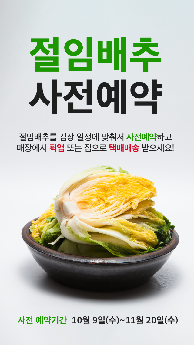 절임배추 사전예약을 통해 올해 김장을 더욱 알뜰하고 쉽게 준비하시기 바랍니다.